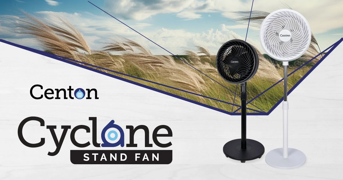 Beat the heat with CENTON Cyclone – the newest, high performance yet compact 90W 8-inch stand fan! Featuring 3-speed setting, adjustable height, and smooth oscillation, it delivers powerful airflow to cool down any rooms.